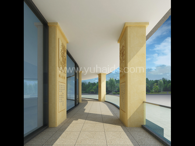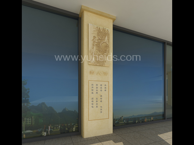 這是一個會所走廊的柱子浮雕效果設計方案,以優質黃金麻石材為材質配以浮雕的形式雕刻裝飾畫及文字內容。柱面尺寸為4400-1100mm。