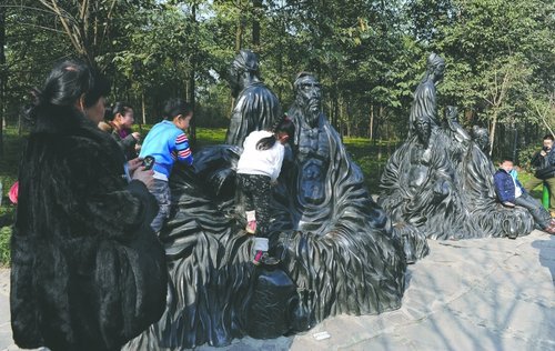 浣花溪公園的詩歌典故園內(nèi),在雕塑“飲中八仙”上,兩名小孩正興奮地爬上爬下,大人則站在一旁吃小吃。詩歌大道上,杜甫、李白和屈原三位詩人的大型集體雕塑平臺上,盡管立有“為了您的孩子的安全,請勿在雕塑臺上嬉戲”的告示牌,卻仍有4名小孩在“詩人”身旁爬來爬去,一位女士只在一旁叮囑:“慢點,不要碰到頭了”。